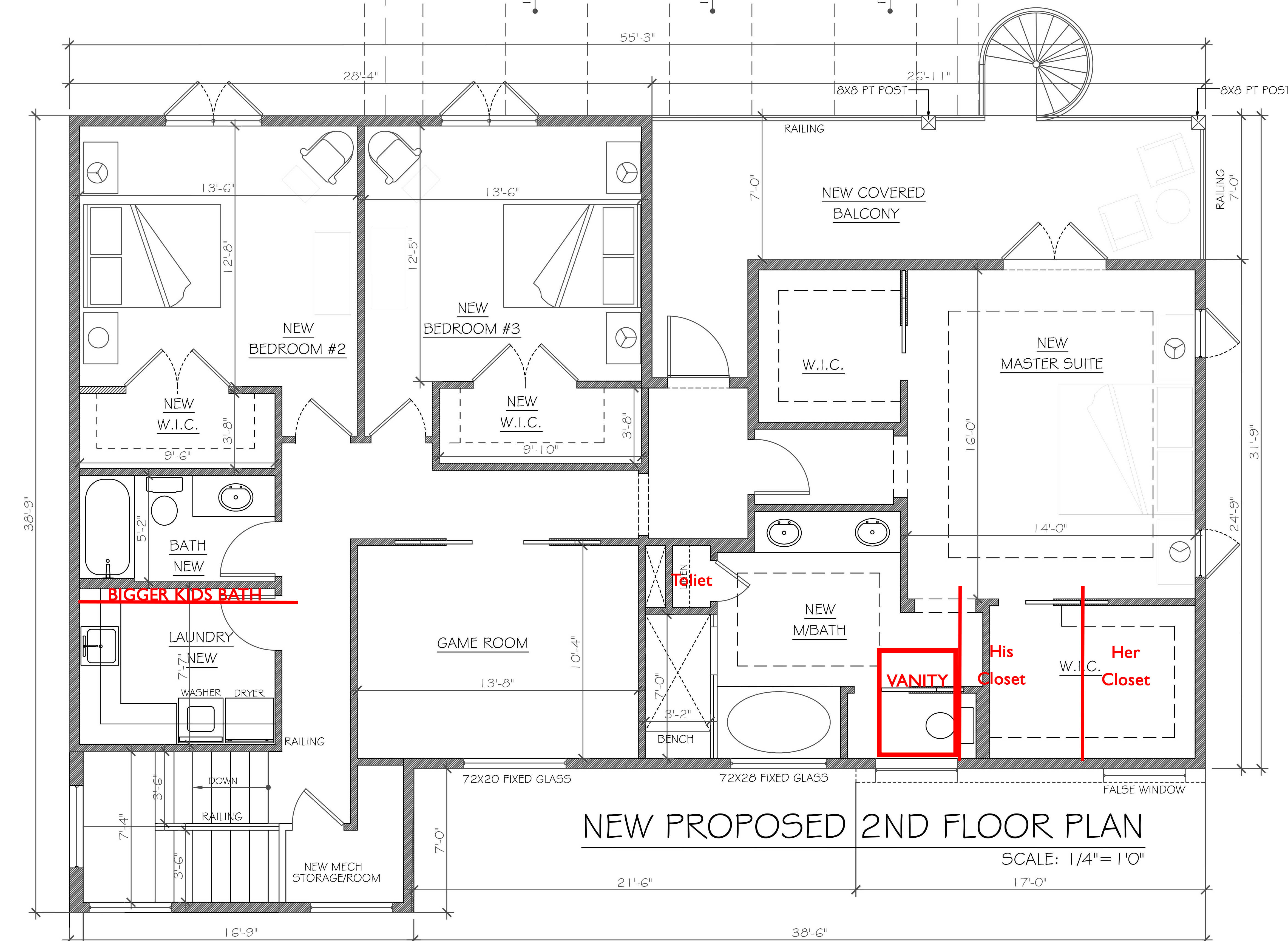 AND….the whole upstairs is almost all framed in. We ended up having to move a few walls around up there. The kids’ bathroom was going to be pretty small and the adjacent laundry room really huge. So, we expanded the bathroom a foot into the laundry room space. Also, we moved the closet space a bit in the master. One thing my husband and I both want is our own closets. I swear he has way more clothes and shoes than I do. It’ll be so nice to have a closet all to myself. Take a look at this rendering of our second story addition with the changes in red. Click on it to take a closer look.