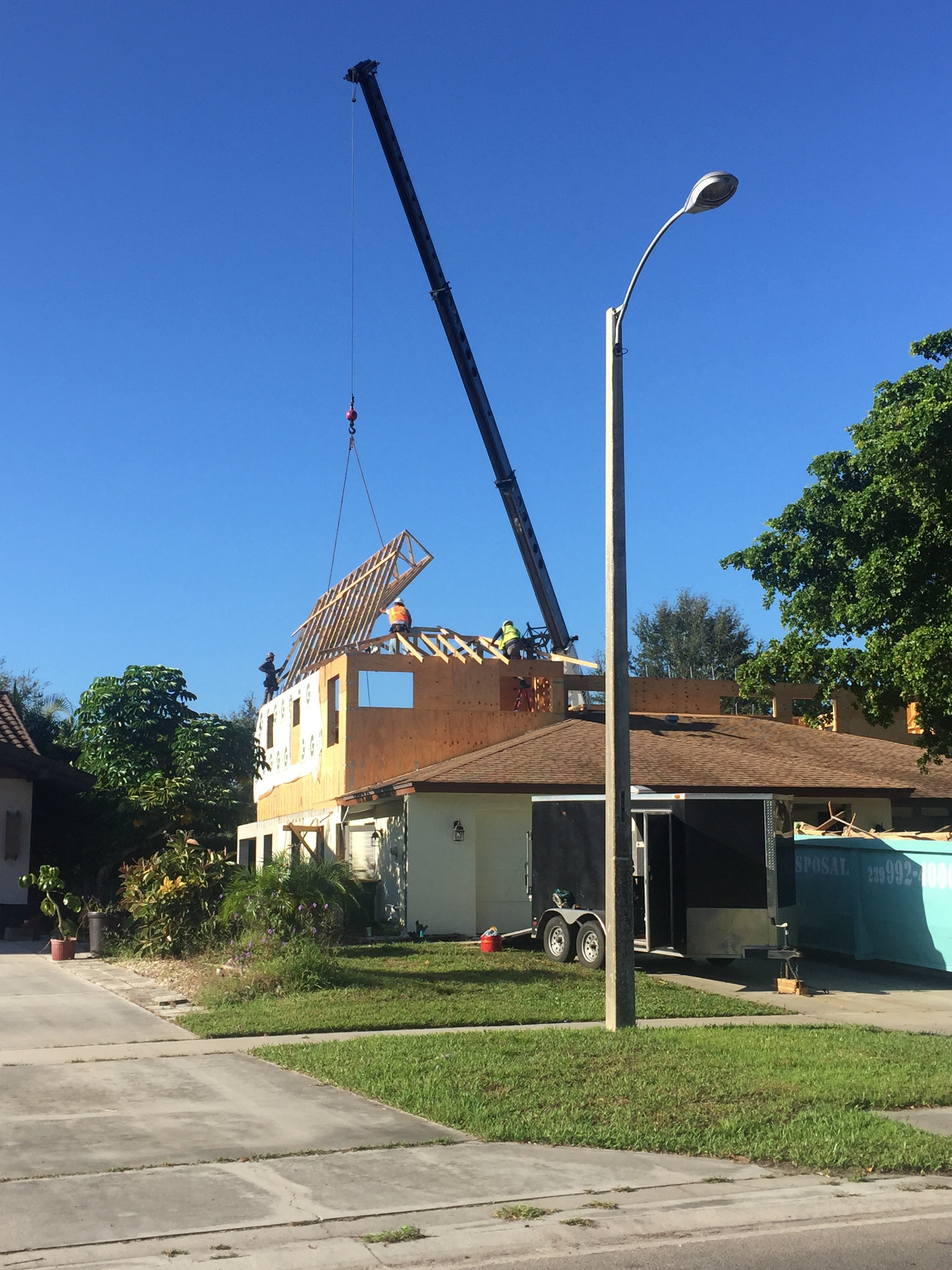 The word delay is not what any home remodeler wants to hear, but that is a word we heard a lot this week (and last). The crane, which is needed to put on our roof trusses, was supposed to be here last week. We thought it would be here Thursday, nope. Then we thought Friday, nope again. Then Monday and Tuesday came, nope and nope. It rained one day last week so apparently that threw off the schedule. Not sure why one days rain threw the schedule off ONE WHOLE WEEK, but it did. So much for sticking to that schedule posted on the wall. I really wanted to be able to post some pictures of our house with the new roof on and completed for today’s update, but alas…..I cannot. However, the crane showed up today so here is a picture of it in our backyard doin’ work! Here is the progression throughout the day.